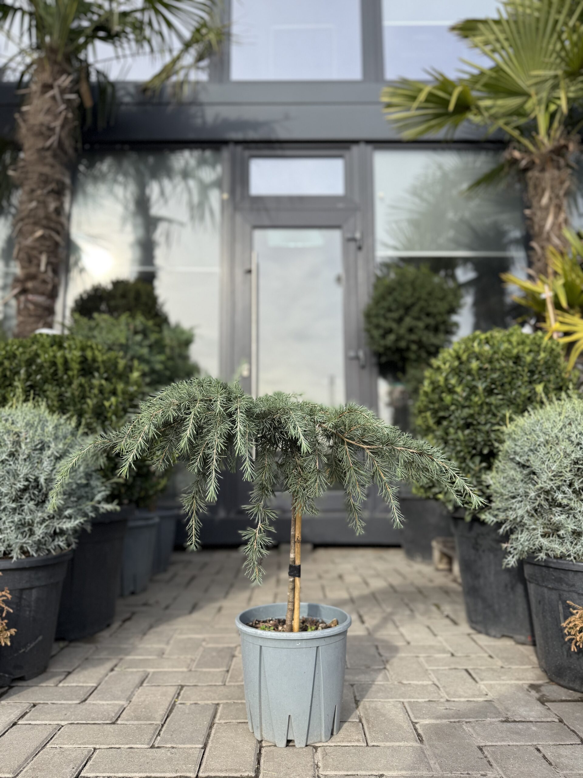 Cedrus Deodara Feelin Blue este o varietate ornamentală de cedru himalayan, apreciată pentru aspectul său elegant și culoarea intensă a acelor. Are o creștere lentă și un port tărător, cu ramuri fine, arcuite, care formează în timp o coroană largă și neregulată, de un farmec natural. Acele sale moi, de un albastru-argintiu profund, oferă un contrast plăcut în grădină, menținându-și nuanța pe tot parcursul anului. Datorită dimensiunilor sale moderate, se pretează excelent pentru grădini mici, stâncării, taluzuri sau ca plantă solitară în spații verzi contemporane. Este o specie rezistentă, iubitoare de lumină, care preferă solurile bine drenate și aduce o notă rafinată oricărui decor peisagistic.