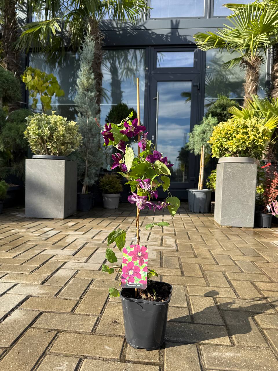 Clematis Warszawska Nike este un soi spectaculos, cu flori mari de un violet intens, perfect pentru pergole, garduri sau alte suporturi verticale. Se plantează într-un loc luminos, ferit de vânturi puternice, în sol fertil, bine drenat și ușor umed. Gropa de plantare se adâncește suficient, rădăcinile se așază la 5–7 cm sub nivelul solului, apoi zona se mulcește pentru a menține rădăcinile răcoroase. Pentru o creștere viguroasă, udarea trebuie regulată, evitând băltirea, iar fertilizarea cu îngrășământ pentru plante cu flori, primăvara și vara, va stimula înflorirea. Clematis Warszawska Nike face parte din grupa 2 de tăiere, astfel că primăvara se elimină doar tulpinile slabe sau uscate, lăsând planta să înflorească bogat. Asigură-i un suport vertical corespunzător, iar aceasta va transforma orice spațiu într-un colț plin de culoare și eleganță.