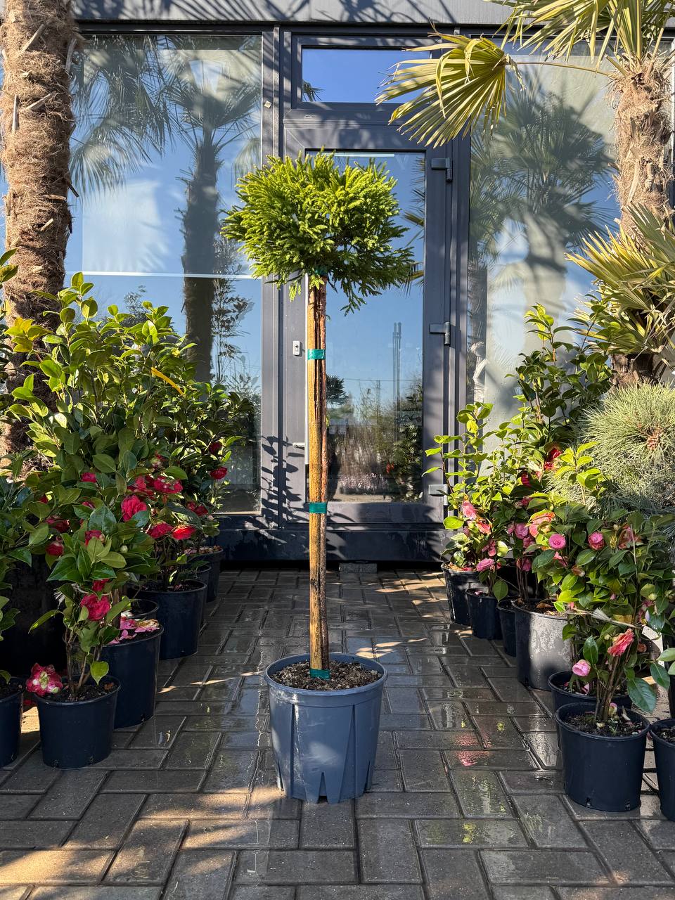 Cryptomeria japonica, cunoscut și sub denumirea de cedru japonez, este un conifer elegant, care poate fi cultivat pe „picior” pentru a crea un efect de copac mic, cu o formă distinctivă. Când este plantat pe picior, cedrul japonez dezvoltă o trunchi vertical, susținând o coroană de frunziș dens și verde, care adaugă un aspect sofisticat și decorativ pe tot parcursul anului. Frunzișul are o nuanță de verde închis, iar în timpul iernii poate capăta nuanțe roșii sau maronii, oferind interes pe termen lung. Cryptomeria japonica pe picior este ideal pentru grădini mai mici sau pentru zone unde se dorește un accent ornamental, fiind rezistentă la condiții climatice diverse și ușor de întreținut. Acest conifer crește lent și poate ajunge la înălțimi moderate, având o formă elegantă și aerisită, perfectă pentru peisaje japoneze sau stiluri de grădină mai formale.